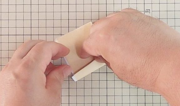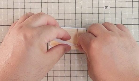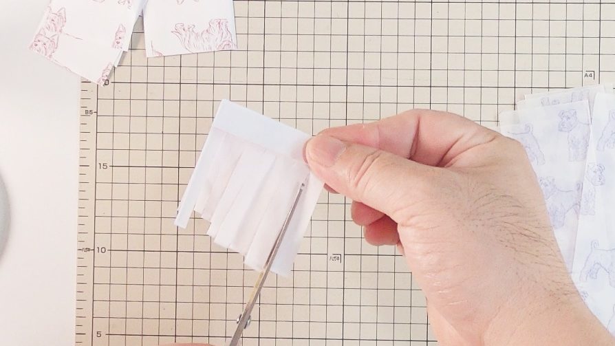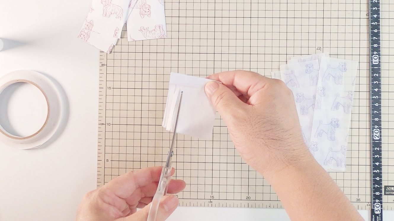 - 折った方の端を1cmほど残し、反対側を短冊状にカット。