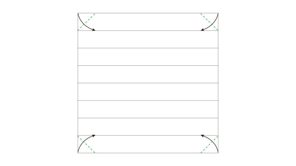開いて、四方の角を折ります。この時点で横に8等分の折り目がついています