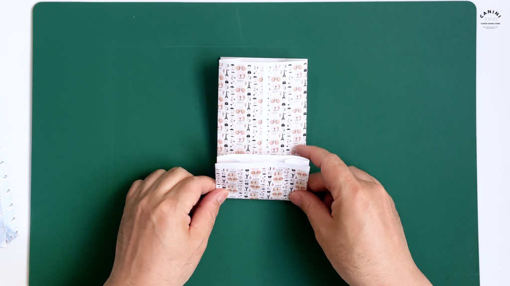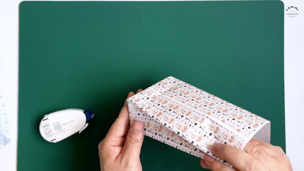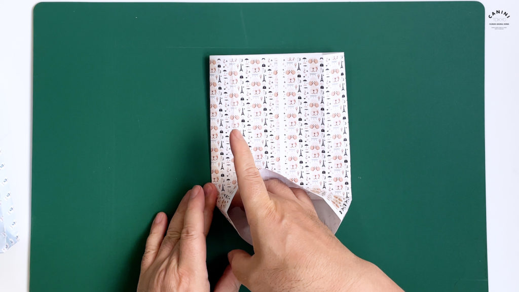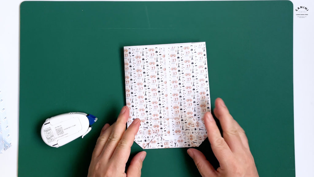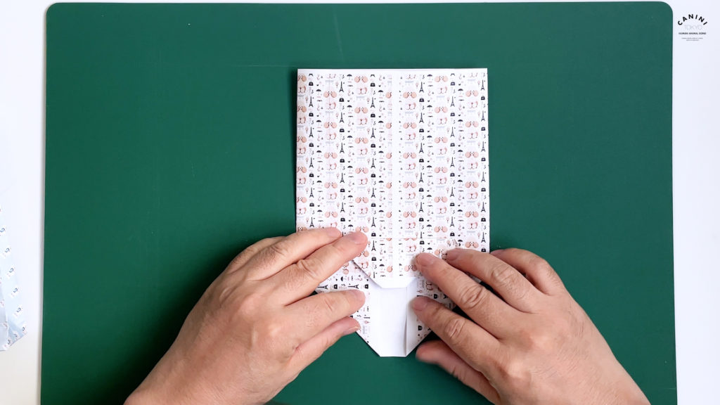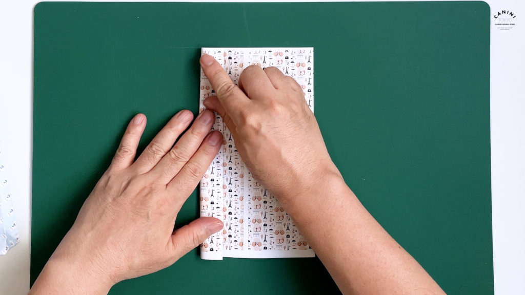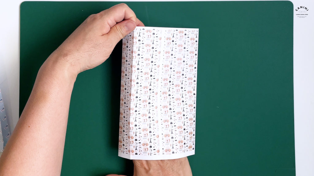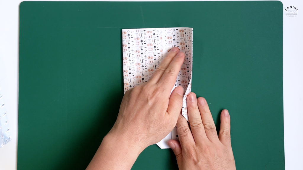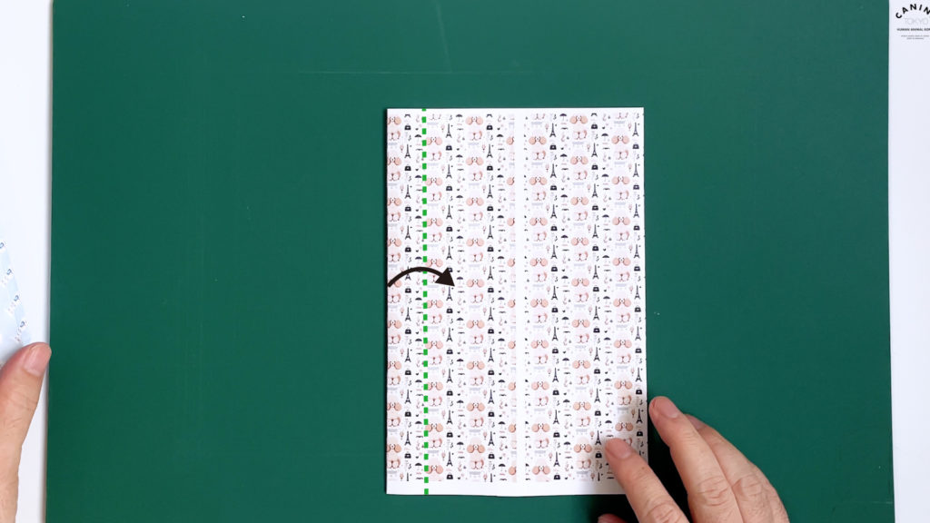 のり代に合わせるように紙を半分に折ります。ぴったり重ねず、1mmほど内側にずらして折るのがポイント。糊づけしてしっかり乾燥させます。