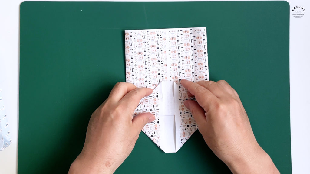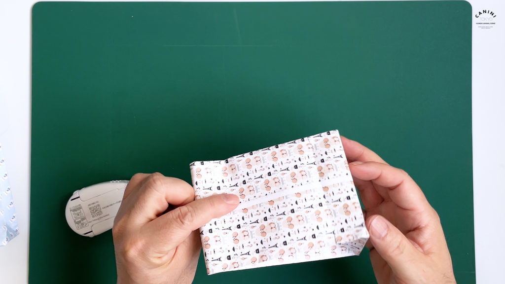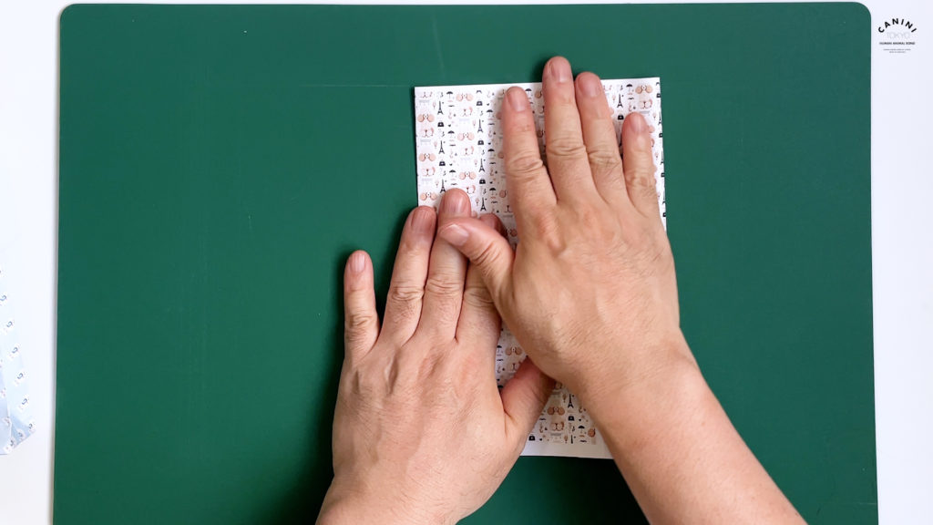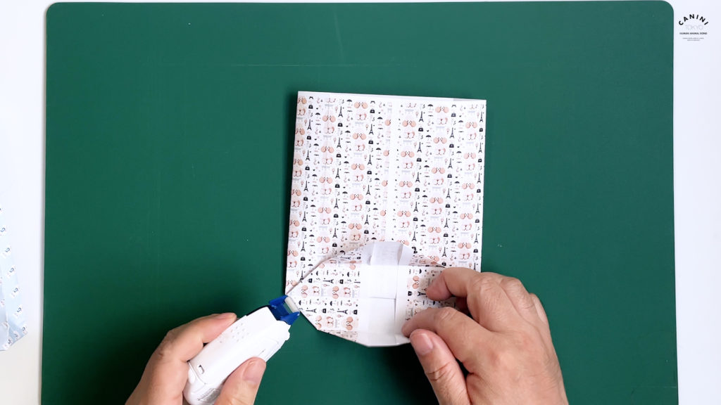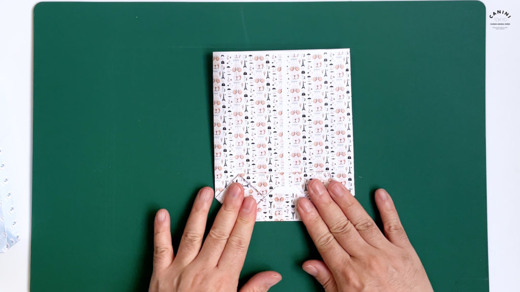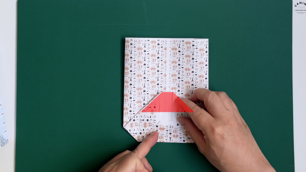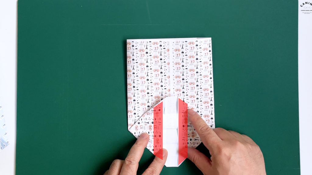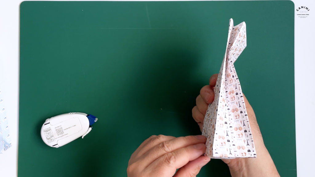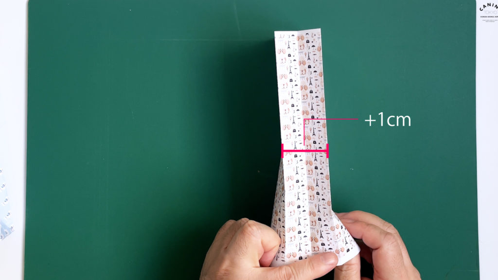 のり代に合わせるように紙を半分に折ります。ぴったり重ねず、1mmほど内側にずらして折るのがポイント。糊づけしてしっかり乾燥させます。