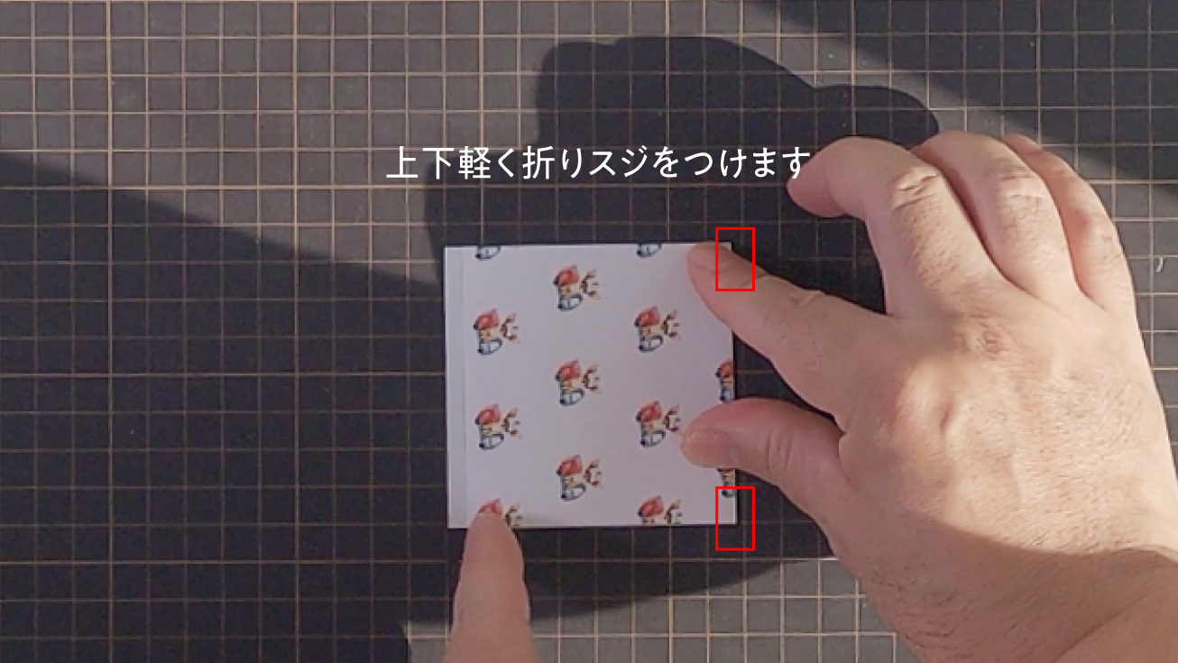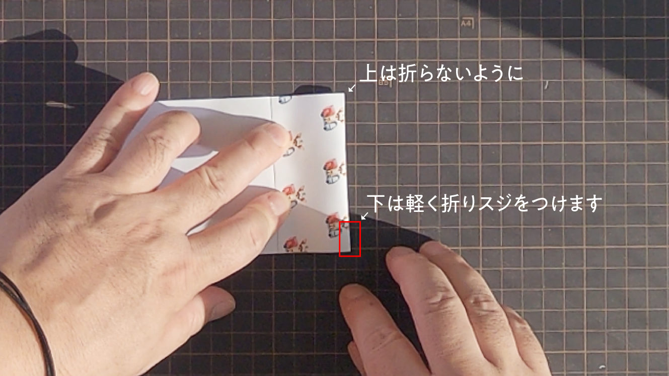 反対側も軽く折りながら下に折スジをいれます。上は折らなくてもOKです