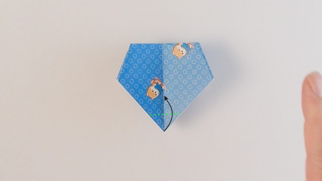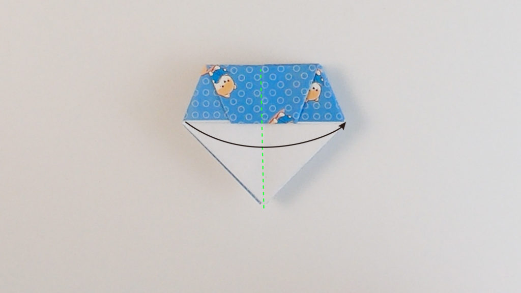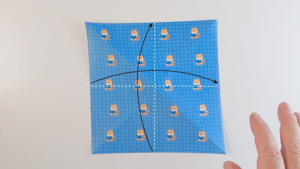 白い面を上にします。三角形になるよいに、点線で半分に折って、折りすじをつけます