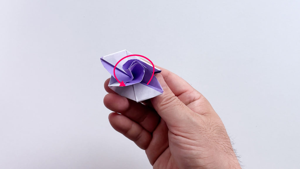 反対側を中心を指先で少し巻き込むようにして、花びらを作っていきます